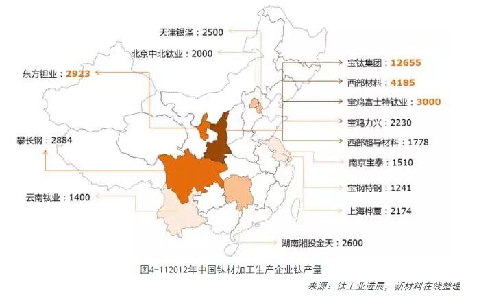 2014年在世界經(jīng)濟繼續處于弱增長(cháng)格局及全球鈦行業(yè)持續低迷的大背景下,中國鈦工業(yè)也難以獨善其身,進(jìn)入了“高產(chǎn)能、微利潤、低需求”的嚴冬期。在國家穩增長(cháng)、調結構、轉變增長(cháng)方式、科技創(chuàng )新發(fā)展的方針指導下,與環(huán)境和諧發(fā)展、促進(jìn)行業(yè)健康和可持續發(fā)展成為經(jīng)濟發(fā)展的主旋律。產(chǎn)能擴張,需求下降以及鈦產(chǎn)品的結構性過(guò)剩,導致鈦制品的價(jià)格一直在低位徘徊。鈦冶煉企業(yè)大都處在虧損或盈虧持平狀態(tài),鈦加工企業(yè)處于微利運行狀態(tài), 2014年是鈦行業(yè)的艱辛之年。圖4-11是鈦材生產(chǎn)企業(yè)分布情況。